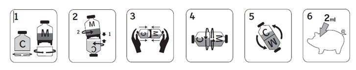 6. Fecskendezze be a keverék egyszeri adagját (2 ml) intramuszkulárisan, testtömegtől függetlenül, a sertéseknek. Beadáskor a vakcinázó eszköz gyártó által mellékelt eszköz leírását kell követni.