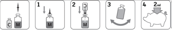 Juttassa az Ingelvac CircoFLEX vakcinát az Ingelvac MycoFLEX vakcina flakonjába. Ha szükséges, enyhén nyomja meg az Ingelvac CircoFLEX vakcinaflakont, elősegítve ezzel az átfolyást.