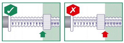 Alkalmazása: A megfelelő mennyiség beadásához használja a fecskendő dugattyúján lévő praktikus kereket. Forgassa a kereket, amíg az a kívánt beadandó mennyiséget jelképező számtól jobbra nem kerül (lásd az alábbi ábrát, amely a 10 ml esetében a helyes és helytelen pozíciót mutatja).