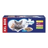 Teljes értékű állateledel felnőtt macskák számára csirkével szószban, borjúval szószban, lazaccal szószban tartósítószer nélkül.