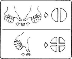 Felezés: hüvelykujjaival nyomja le a tabletta mindkét oldalát. Negyedelés: hüvelykujjával nyomja lefelé a tabletta közepét.