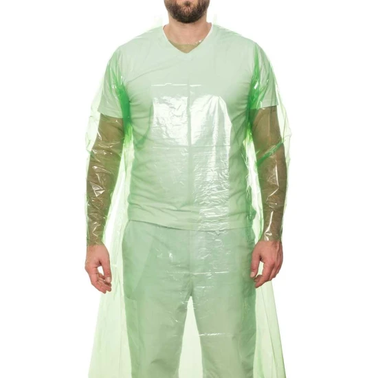 Nem steril, eldobható védőköpeny hosszú ujjakkal és mandzsettával. Zöld polietilénből (PE) készült.